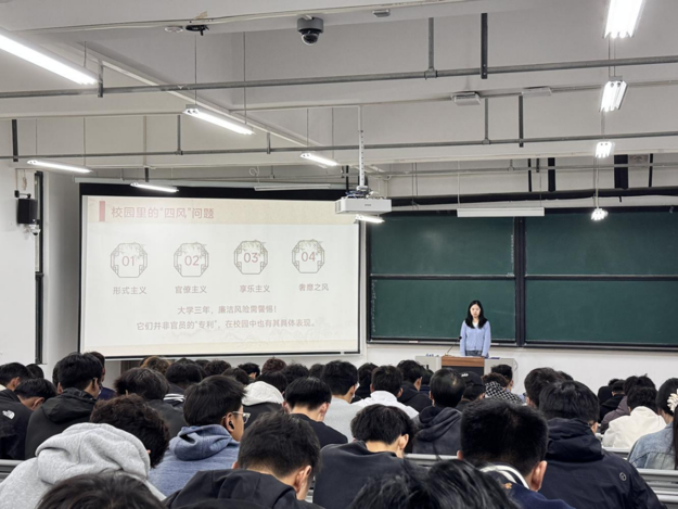 班会焦树立正确世界观、人生观、价值观核心目标,以丰富多样的形式深化廉洁教育实效。班会上,团支部书记韩云结合校园奖助学金评定、社团干部选举等常见场景,生动讲解廉洁自律的重要意义,不仅系统学习了校纪校规和老员工行为准则。还结合体育专业特点,深入剖析了赛事公平、诚信应试、团队协作等方面可能存在的廉洁风险点。通过生动的正反典型案例分析,着重强调“廉洁是立身之本,纪律是前行之基”,系统阐释了“廉洁”的内涵——既是“品行清白、清廉自守”的品质,在校园视角下也等同于“诚信+节俭+规则意识”的结合,并列举了形式主义、官僚主义等校园“四风”风险点,提醒新生警惕日常中的廉洁隐患,叮嘱新生要从入学之初就守住小节、远离红线。